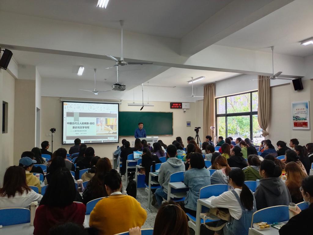 此次讲座,马教授以“中国古代士人的离散-回归意识与文学书写——以唐宋贬谪文学为例”为题,与在场师生分享了他的研究成果。他首先解释了文学领域中“离散”的概念、起源、本义和发生的文化机制,分析了离散与“贬谪”的关联和异同。其次分点论述了古代中国士人“离散-回归”意识的独特内涵,及其文学书写的独特风貌和不可忽视的文化价值。马教授的讲座内容丰富,学贯中西,融通古今,视角新颖,见解深刻,引起了现场师生的共鸣。整个讲座过程,现场掌声不绝。