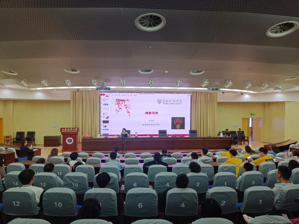 5月26日晚,应江苏海洋大学写作学院邀请,盐城师范学院文学院王玉琴教授在会议中心黄海厅举办创意写作专题讲座。此次公开课由文法学院中文系袁丁博士主持,写作学院全体学生参加。讲座全程在抖音等平台进行线上直播。