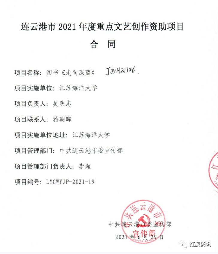 根据《连云港市重点文艺创作项目资助办法》规定,凡是接受经费资助的精品创作项目,要努力作品主题深刻、能体现先进文化前进方向和时代主旋律,满足人民日益增长的精神文化需求,力争获得省“五个一工程”奖。长篇报告文学《走向深蓝——江苏海洋大学创建纪实》书稿计划于2021年10月1日前完成,2021年12月31日前正式出版。
