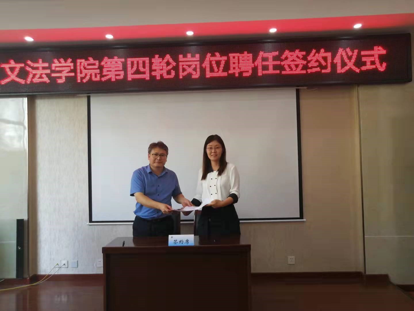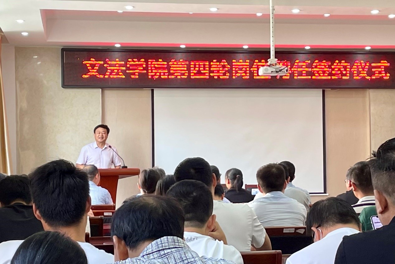 9月29日下午,文法学院在文渊楼314举行第四轮岗位聘任签约仪式。院长吴明忠与教师代表签订了岗位聘用合同书。党委副书记王国银主持会议,院领导和全体教职工参加签约仪式。