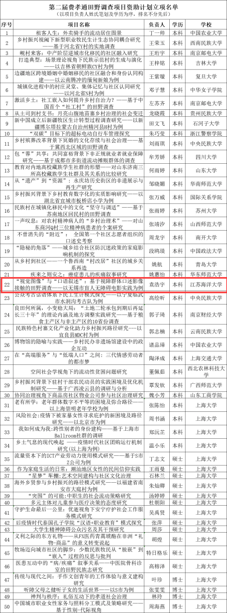 8月18日晚,“第二届费孝通田野调查项目资助计划”立项名单公示。我院新闻学专业2020级本科生袁浩宇、李彤、郭欣悦、左罗、张建越、周子杰,以及新闻学专业2018级本科生张涵溪组成的“田野小分队”,在新闻广告系邱立楠博士的专业指导下,申报的《“视觉图像”与“口语叙述”:基于视障群体口述影像接触的田野调查——以无锡市盲人无障碍电影实践为例》项目获得立项。