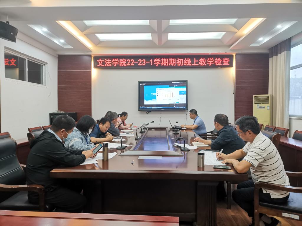 为维护正常教学秩序,文法学院对2022-2023-1学期期初线上教学情况进行了检查工作。8月29日上午8时在文渊楼216会议室,学院党委书记魏范青、院长吴明忠、党委副书记王国银、副院长颜金和学院教学督导组全体成员参加了此次检查工作。