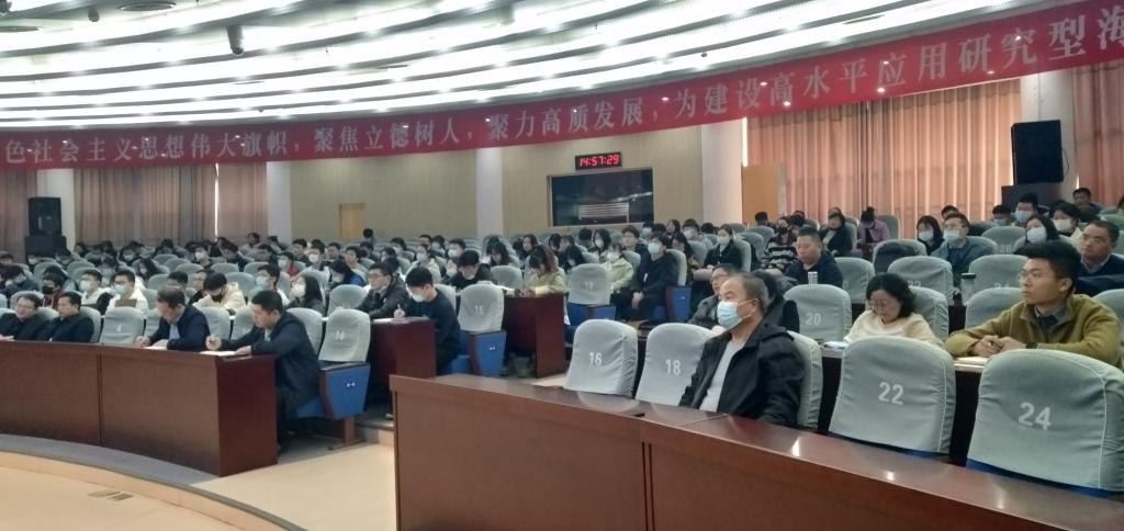 张学武将报告分为两个部分,第一部分是要明确认识党的二十大的主题、背景、重大意义与成果,以此加强师生们对于二十大会议内容的理解。第二部分张老师从过去五年的工作和新时代十年的伟大变革,开辟马克思主义中国化时代化新境界,新时代新征程中国共产党的使命任务,全面建设社会主义现代化国家的重大任务,坚定不移全面从严治党和深入推进新时代党的建设新的伟大工程五个方面,对党的二十大精神进行了深入阐述和系统解读。参会师生聚精会神聆听,认真记录要点。