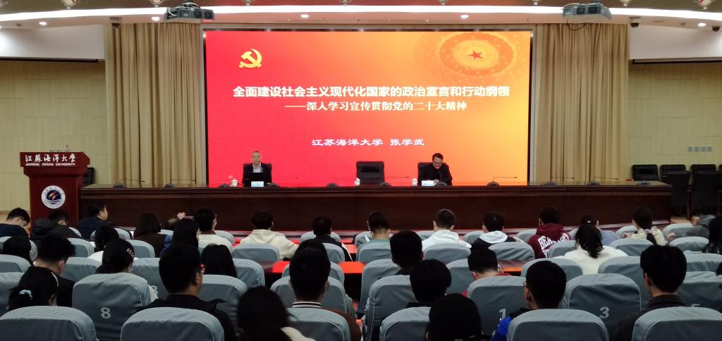 11月9日下午,文法学院与电子工程学院在学校会议中心黄海厅联合举办“学习贯彻党的二十大精神”专题报告会,会议邀请了学校学习贯彻党的二十大精神宣讲团成员张学武同志作“全面建设社会主义现代化国家的政治宣言和行动纲领”专题报告。文法学院党委书记魏范青主持报告会。