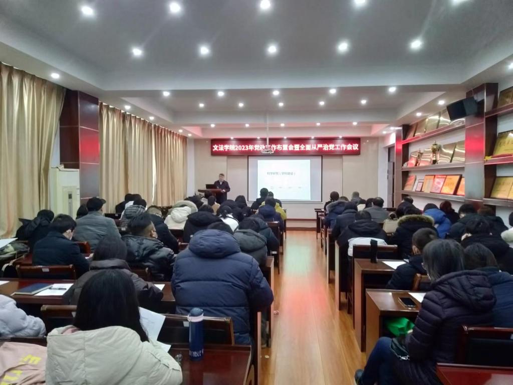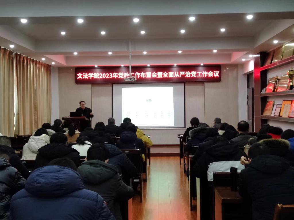 2月12日上午,文法学院召开年初工作传达布置会,传达学校2023年党政工作布置会暨全面从严治党工作会议精神,布置落实学院年度党政工作和学期初的具体工作任务。全体教职工参加会议,会议由党委书记魏范青主持。