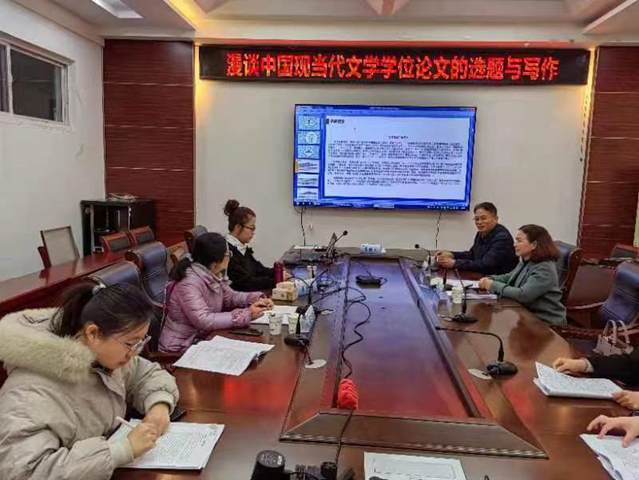 江苏师范大学黄德志教授作题为“漫谈中国现当代文学学位论文的选题和写作”讲座。他结合江苏省硕士研究生论文抽检和评价指标细则、江苏省优秀硕士论文评定标准等进行了一场精要的专题解读和指导,让师生们更加清晰地了解了硕士论文的学术质量、学术规范和学术道德等方面的要求,对提高研究生论文质量具有很好的指导意义。