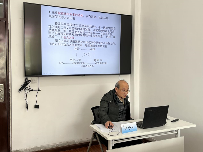 南京师范大学江守义教授作题为“文学叙事学的研究与反思”讲座。他指出,为了发展中国叙事学,首先要接受西方叙事学之前的叙事批评,文史不分的叙事批评。其次,接受西方叙事学之后(有理论自觉)的叙事研究。最后也是最重要的,要参照西方叙事理论,建构有中国特色的叙事批评。