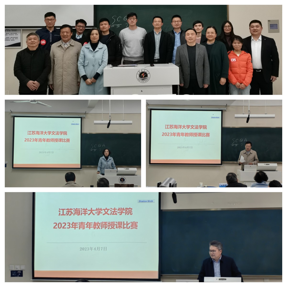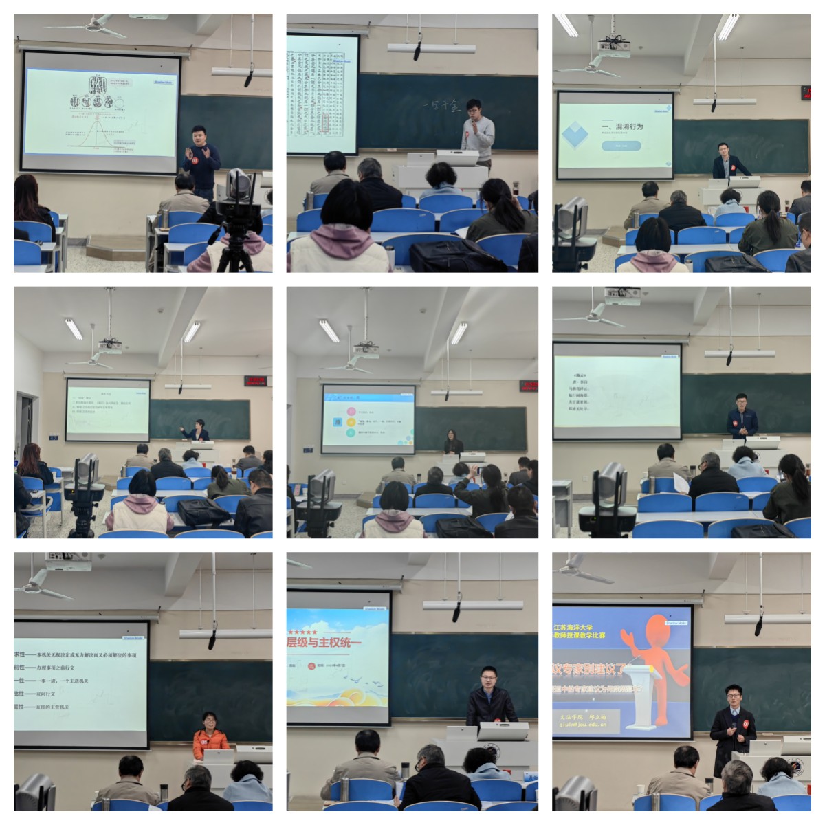 为落实立德树人根本任务,加强青年教师培养,促进青年教师教学能力提升,2023年4月7日文法学院在文华楼105举行了2023年青年教师授课比赛。本次比赛共有来自中文系、法学系、公共管理系和新闻广告的9位教师参赛。校党委常委、宣传部部长杨雪英教授,校督导组刘平昌教授,海洋经济研究院吴价宝教授,药学院马卫兴教授和马克思主义学院院长沈春梅教授应邀担任评审专家。文法学院院长吴明忠、副院长颜金和学院40岁以下的部分青年教师现场观摩。