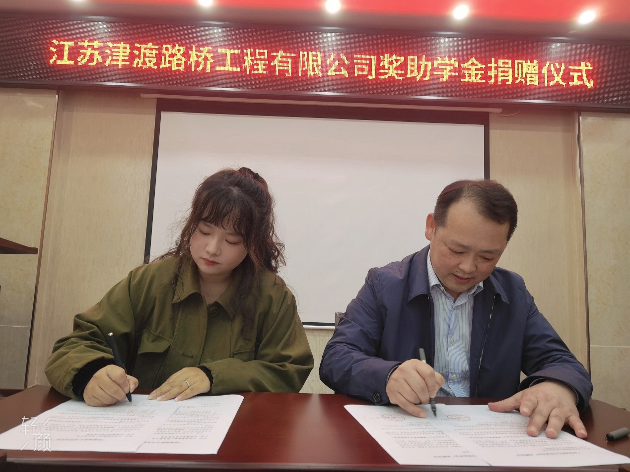 仪式上,陈美琼和王国银代表双方签订捐赠协议并举行捐赠仪式。江苏津渡路桥工程有限公司向江苏海洋大学文法学院一次性捐赠人民币贰万元,用于奖励及资助学院里的优秀贫苦学生。