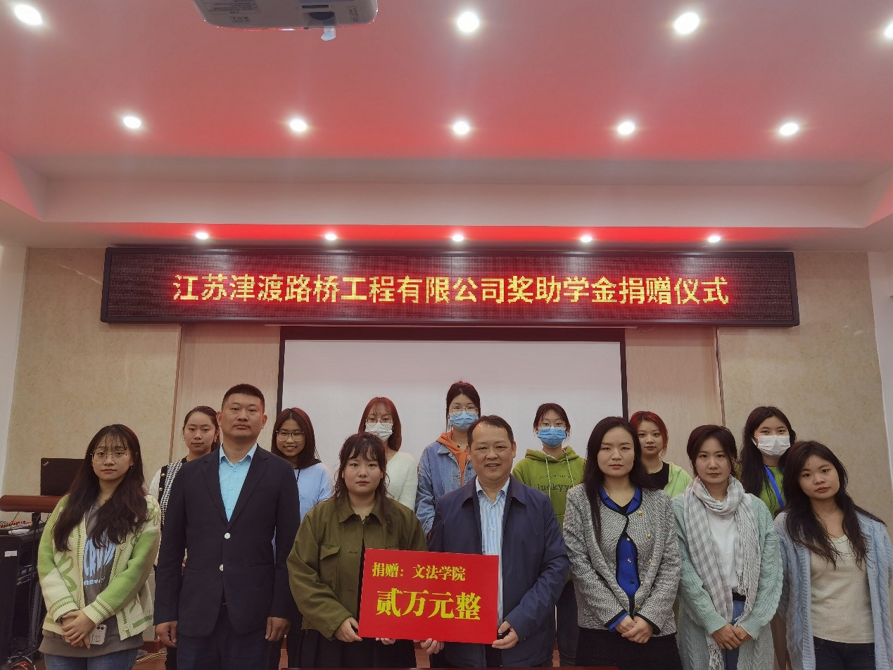 4月21日上午,江苏津渡路桥工程有限公司奖助学金捐赠活动仪式在文渊楼312会议室顺利举行。出席本次捐赠仪式的有江苏津渡路桥工程有限公司总经理陈美琼、办公室主任张杰、文法学院党委副书记王国银、资助工作辅导员老师张宇。文法学院学工办副主任赵亚婷主持本次捐赠活动仪式。