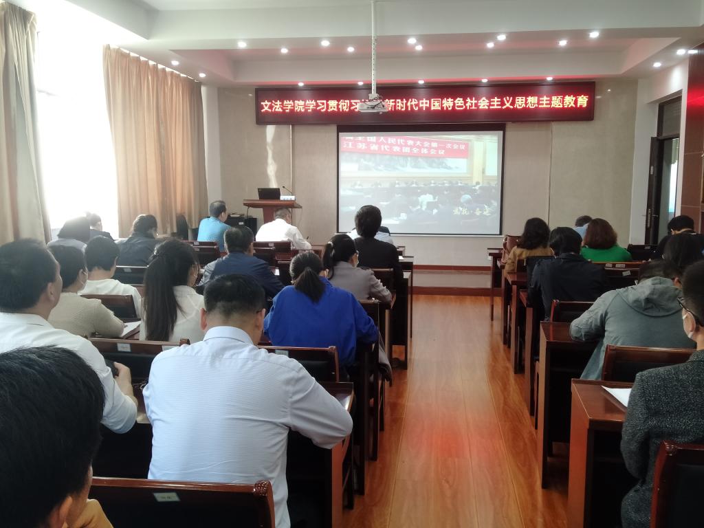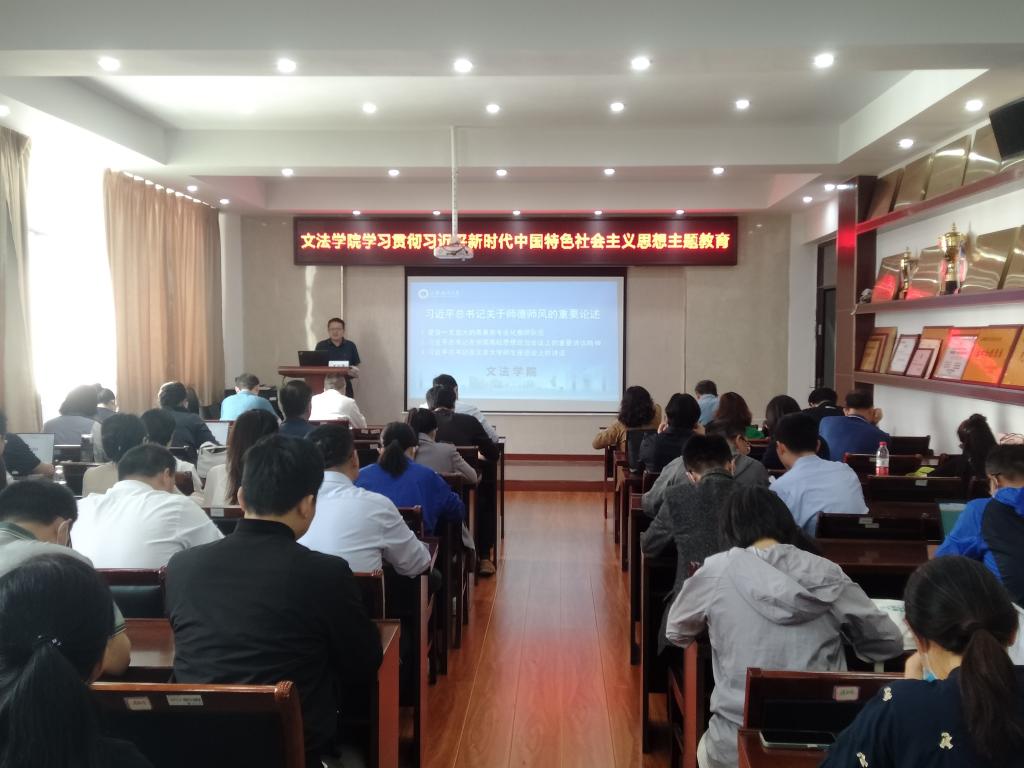 5月31日下午,文法学院在文渊楼314深入开展学习贯彻习近平新时代中国特色社会主义思想主题教育的师德师风专题学习,学院全体教职工参加会议,党委书记魏范青主持会议。
