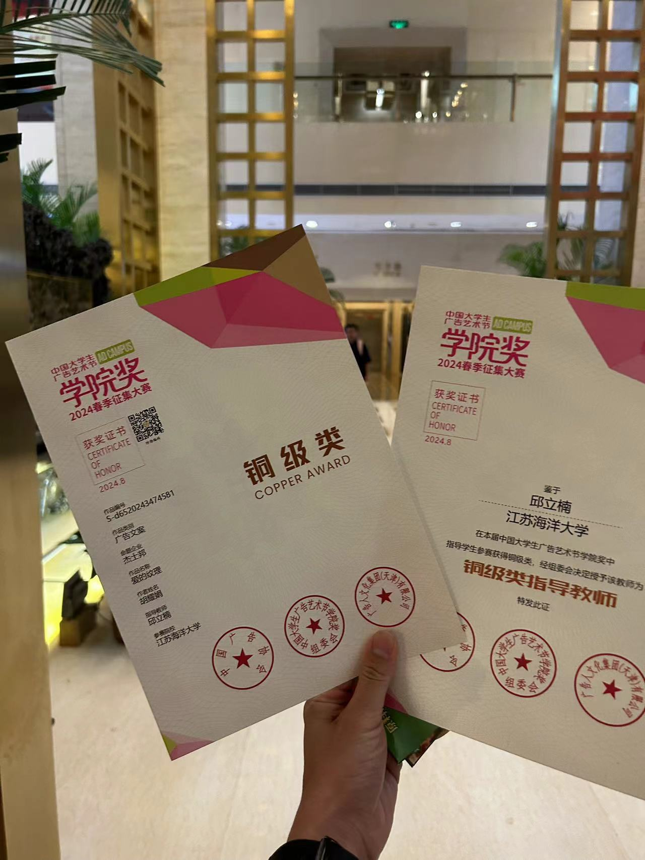 8月24日上午8时30分,中国大学生广告艺术节学院奖2024春季征集大赛颁奖典礼在北京广播大厦召开。由我院新闻系邱立楠老师担任指导教师,我院新闻1232胡耀娟同学完成的《爱的纹理》广告文案,取得良好的成绩,荣获铜级奖。