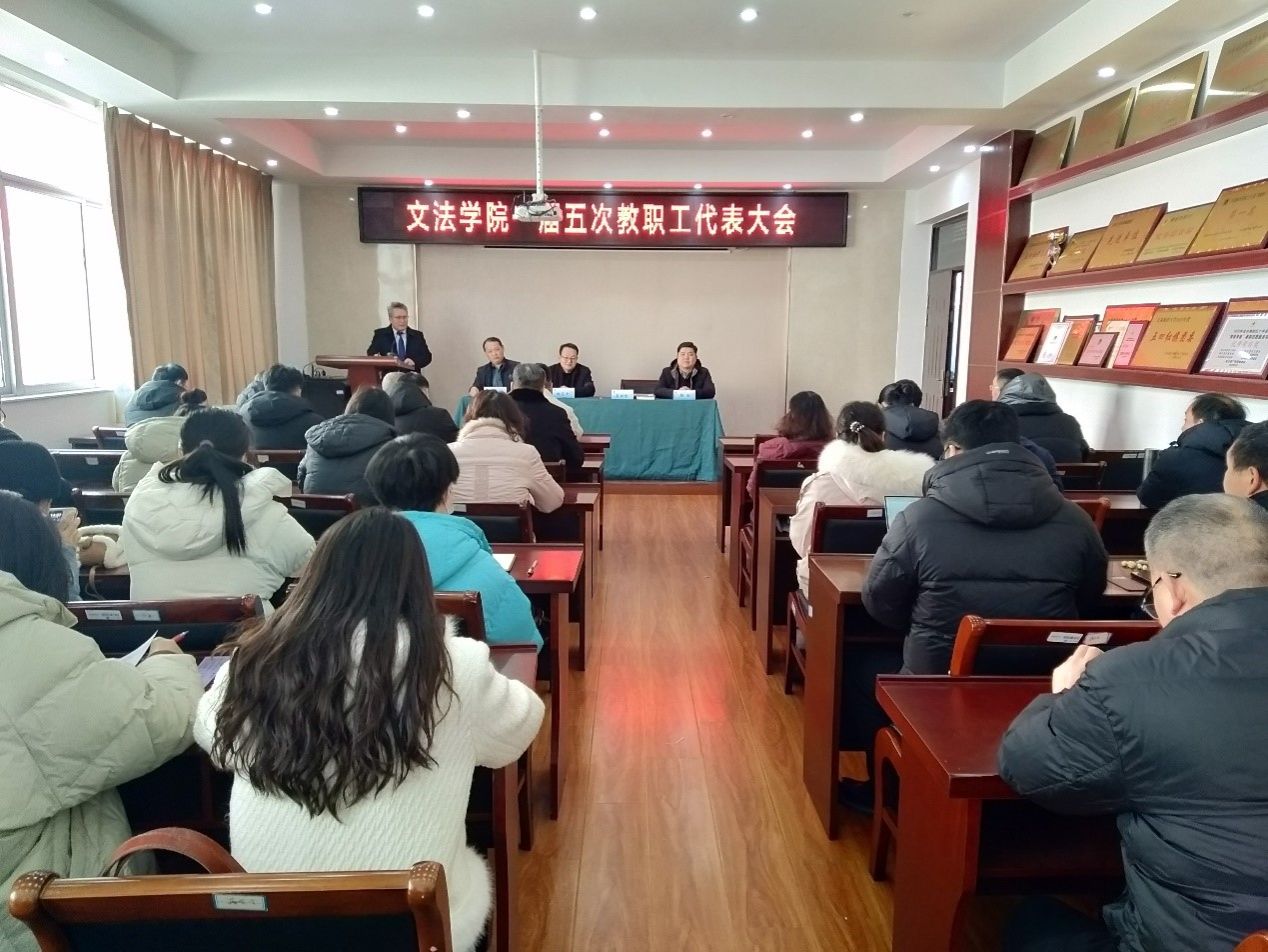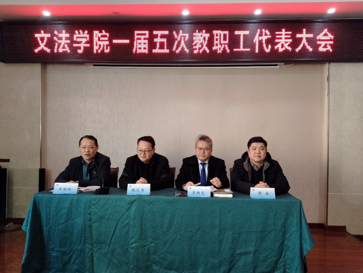 1月8日下午,文法学院在文渊楼314会议室召开第一届五次教职工代表大会,文法学院领导班子出席会议,全体教职工参加大会,党委副书记王国银主持会议。