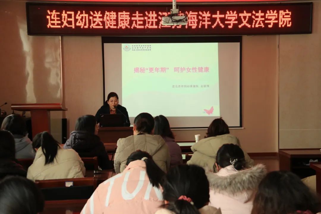 本次活动分为授课宣讲和义诊两个部分。宣讲伊始,连云港市妇幼保健院更老年期保健科主任、青春期保健科主任彭新秀开展了《揭秘“更年期”,呵护女性健康》的讲座,向老师和同学们普及了关于更年期的专业知识。她强调,更年期女性所面临的身心压力与风险是不可小觑的,因此,尽早采取措施、进行科学治疗并积极配合是应对之道。同时,她指出,女性的身心健康不应仅仅因为“更年期”这一标签而被轻视。更年期是女性生命中的必然阶段,我们应当学会管理和调节,防止其演变为严重的健康问题。
