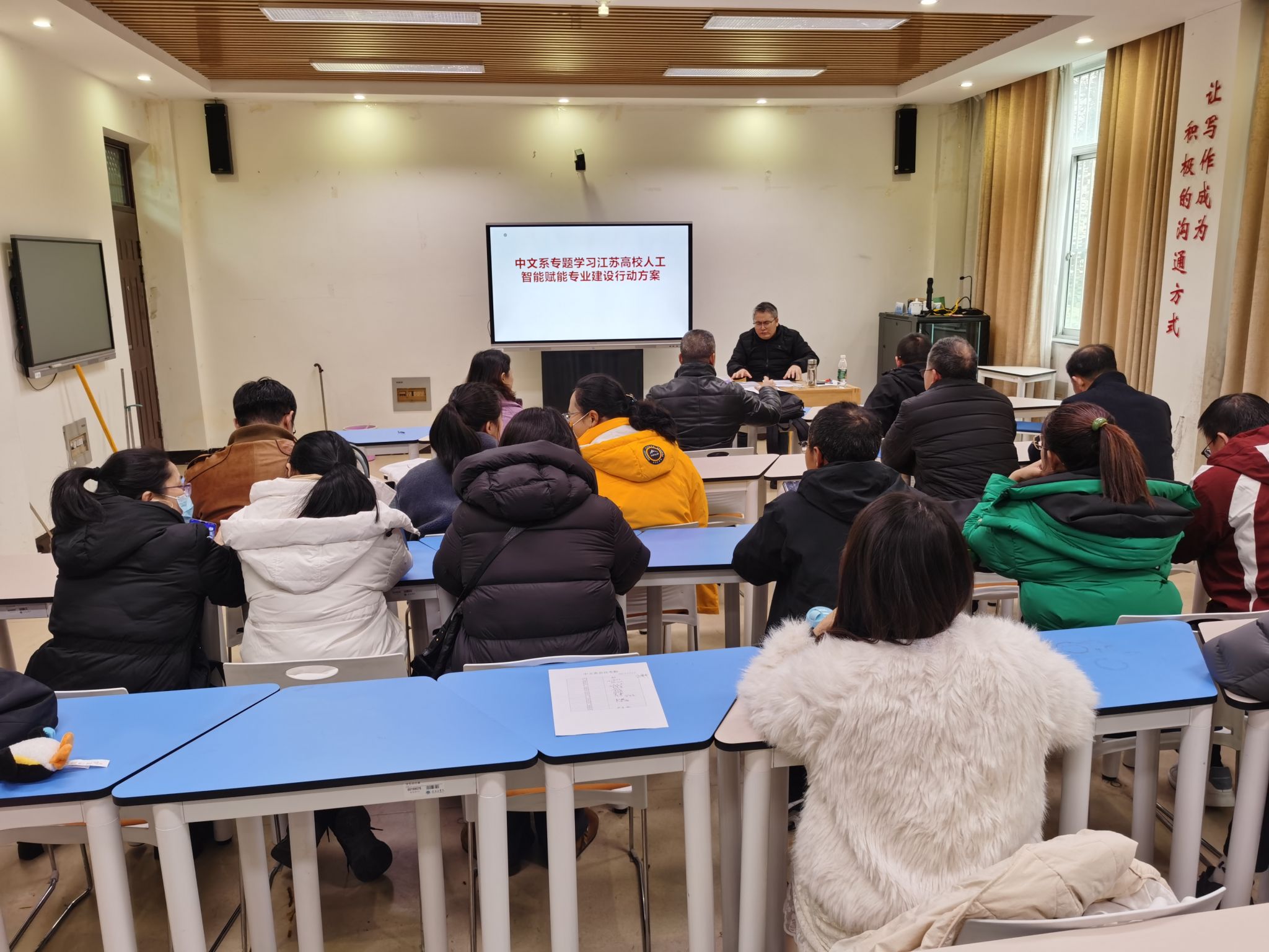吴明忠在带领大家原原本本学习《江苏省人工智能赋能专业建设行动方案》的基础上,分享了自己的学习体会。他指出,今年学校本科教育教学改革的重点之重是落实《江苏省人工智能赋能专业建设行动方案》,中文专业必须快速响应,积极行动。