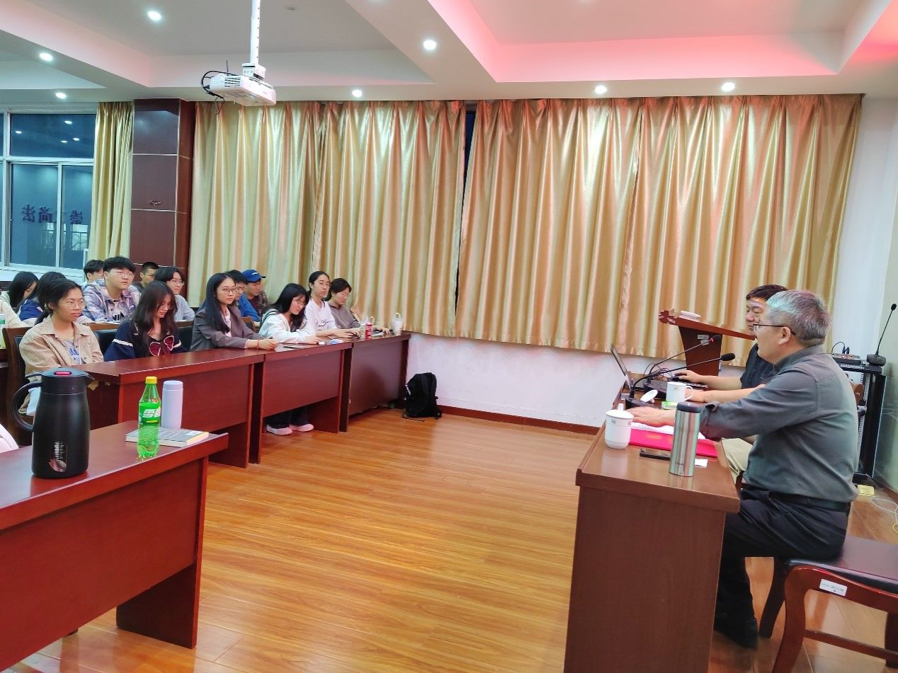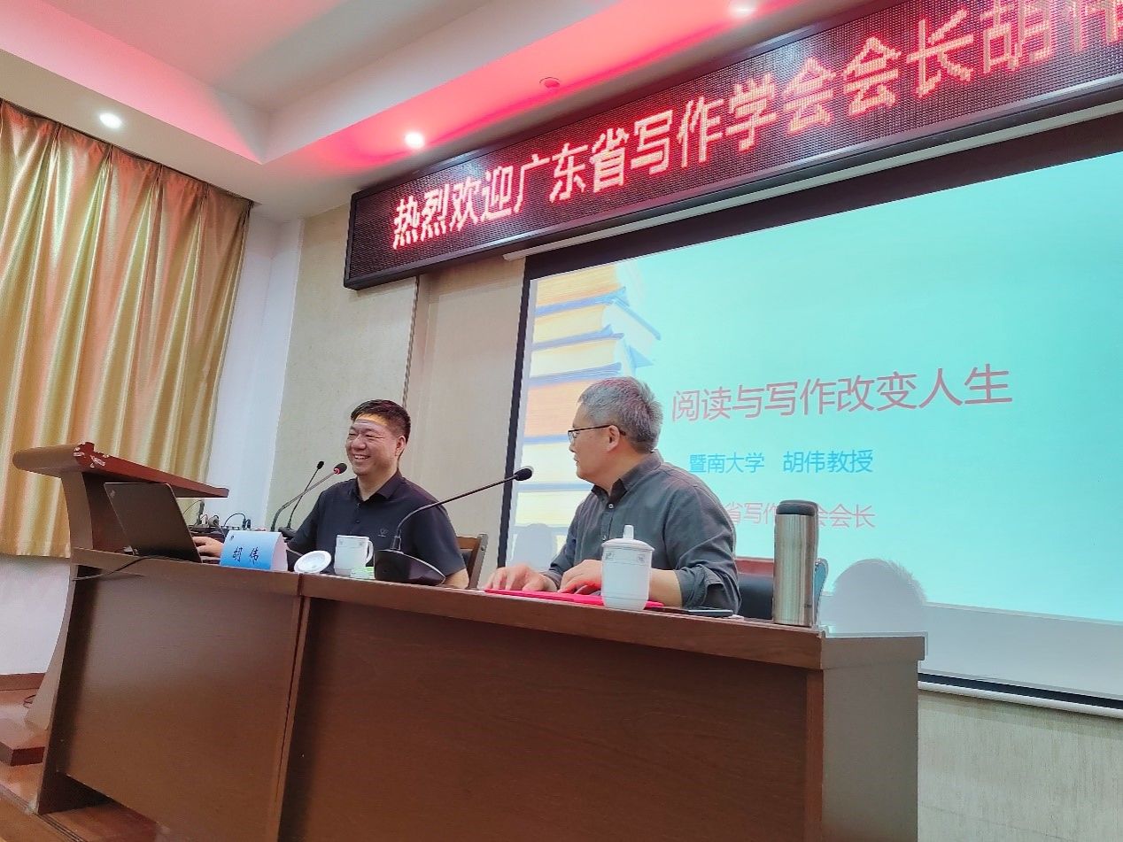 当晚7点,广东省写作学会会长胡伟莅临我校,和中文系同学分享个人成长经历,畅谈写作对人生命运的积极影响。胡伟教授从中专学历、中学语文教师起步,经过多年不懈努力,成为华南师范大学文学博士、复旦大学博士后,现为暨南大学教授。他主持国家社科基金等多项高级别课题,发表学术论文数十篇,出版《河南滑县方言研究》《西汉文献动词研究》等多部学术专著,主编《大学写作》《创意写作》《公文写作》《应用文写作》等多部教材。他的自传体长篇小说《我们在路上》即将在河南文艺出版社出版。2024年1月当选广东省写作学会会长,开辟了省级写作学会教学、研究和社会服务的崭新局面。人民日报等多家国家主流媒体予以报道。