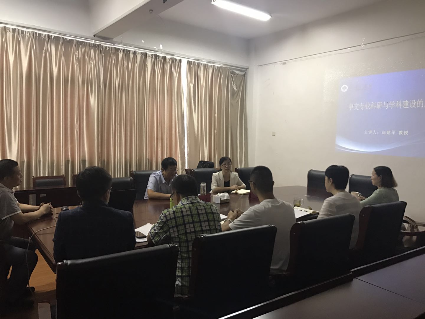 2018年9月20日下午3点,文学院在学院会议室举办了专题为“中文专业科研与学科建设的反思”的座谈会,本次座谈会特邀江南大学赵建军教授莅临指导,由文学院院长安俊丽教授主持,参加本次座谈的有芦海英副院长、张景兰教授、王恩建教授、张兴龙副教授、李高博士、王一帆博士、周固成博士、李乃东博士。